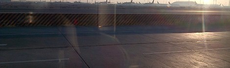 Transit stop in Doha. Sunrise and busy airport.
